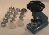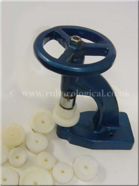 Large case back / flat glass press with assorted nylon dies & specially made flat wooden base for glass fitting.